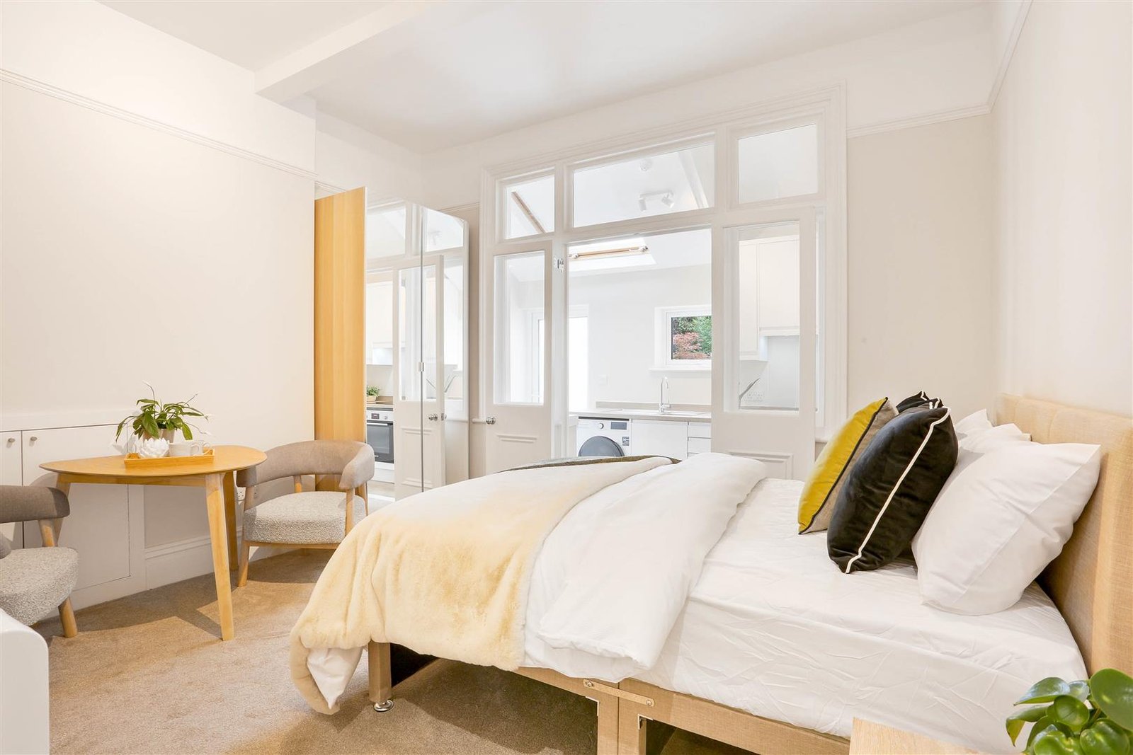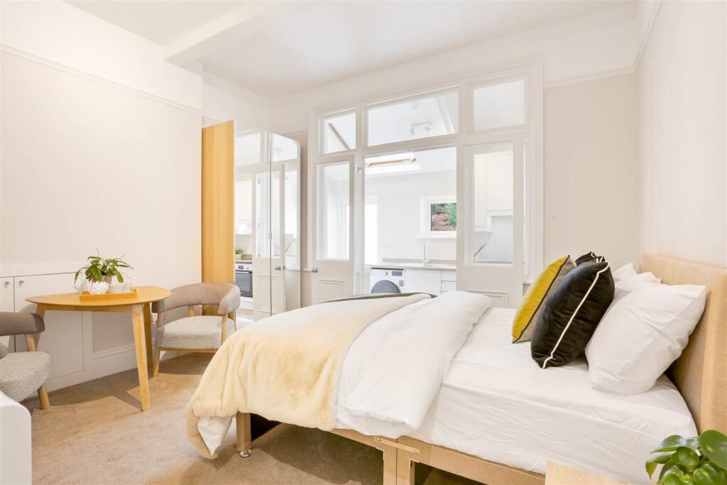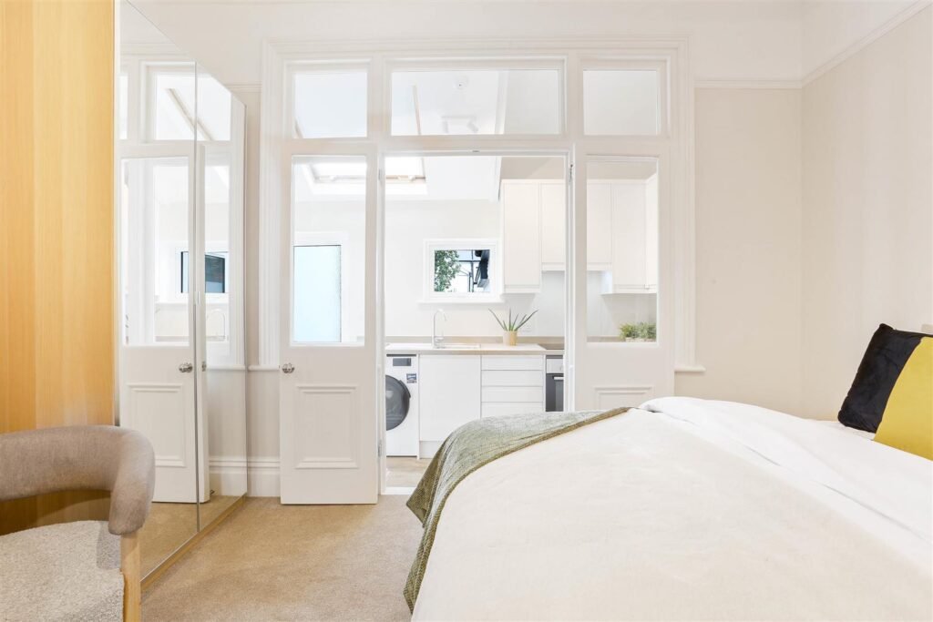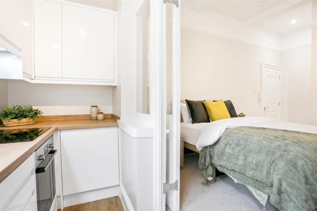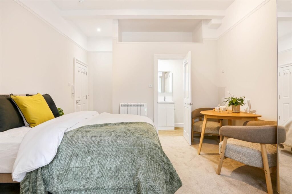 Ideal for professionals, couples, or students, these self-contained studios combine contemporary style with practical living. Each unit is fully furnished and thoughtfully designed, featuring a comfortable double bed with storage underneath, large wardrobe, chest of drawers, and plenty of storage. The modern private kitchen comes fully equipped with a fridge, oven, microwave, two-ring hob, extractor fan, and washer-dryer for everyday convenience. A sleek, en-suite bathroom with high pressure rainfall shower completes each apartment.