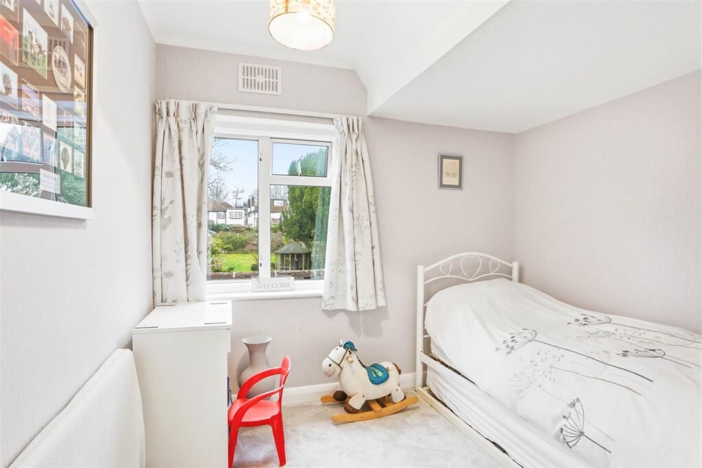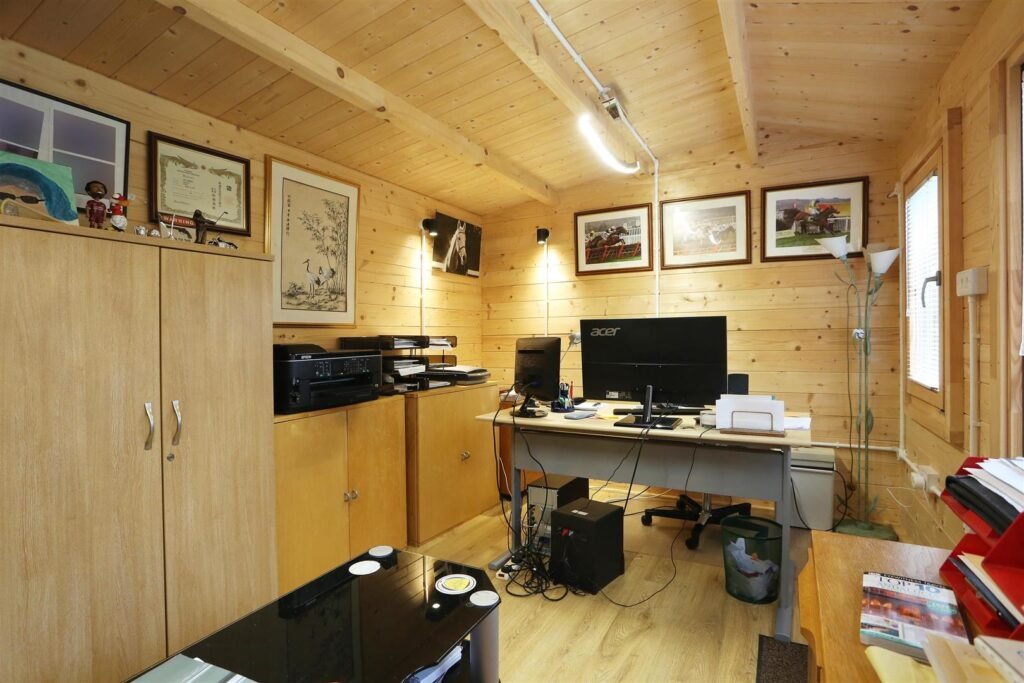 The garden is a delightful outdoor space, ideal for children to play and for family gatherings. Additionally, a superb cabin in the garden presents an excellent opportunity for those working from home, providing a quiet and dedicated workspace away from the main house.