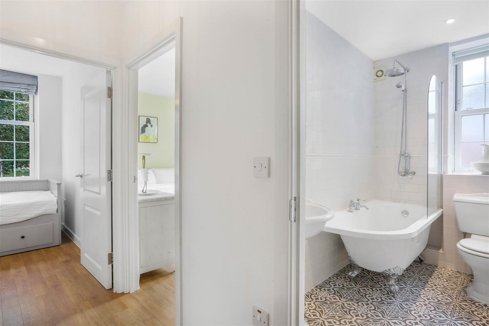 There are two good size bedrooms and a stunning, refurbished bathroom featuring a lovely roll top bath with shower above.