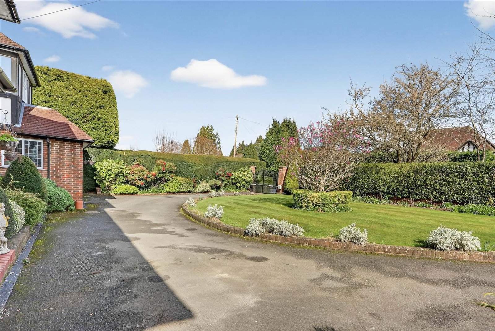 Externally, the property enjoys a substantial private rear garden backing directly onto Cuddington Golf Club, offering attractive views and a rare sense of privacy and openness. To the front, a gated carriage driveway provides extensive off-street parking and access to the garage.