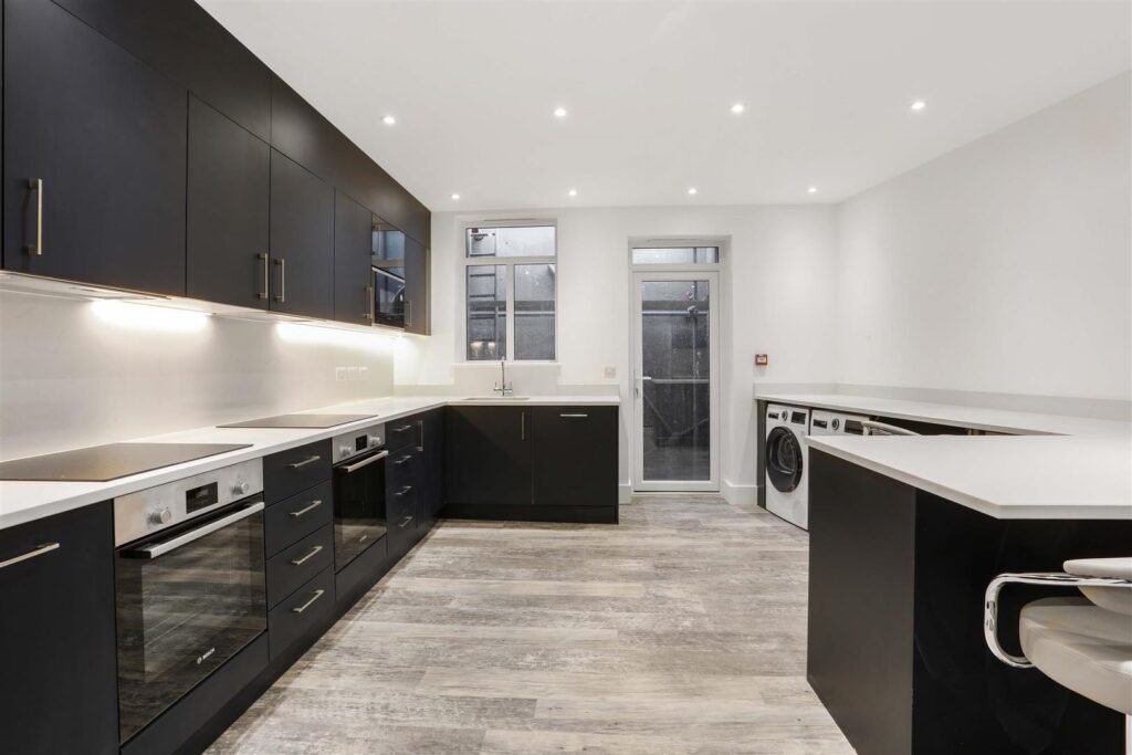 The shared kitchen, situated on the lower ground floor, is fully equipped with a breakfast bar, two cookers, two hobs, two fridge freezers, a dishwasher, washing machine, and dryer—ideal for those who enjoy cooking and socialising.
