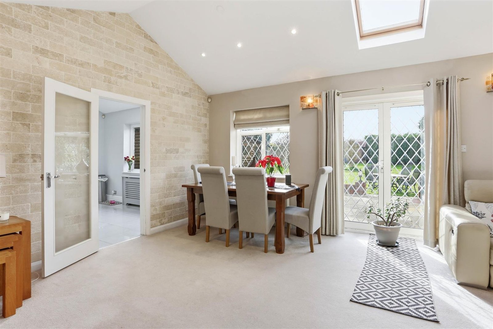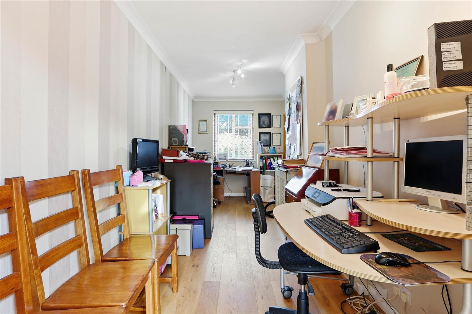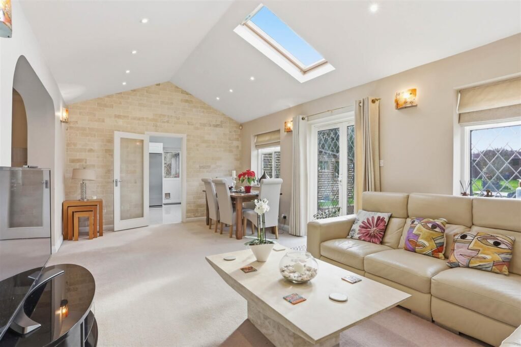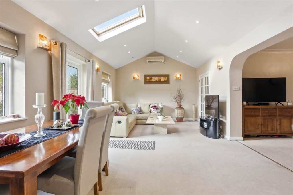 This attractive property offers well-balanced accommodation and an excellent opportunity to create a superb long-term home in a highly desirable setting. The ground floor features a generous living room which flows seamlessly into the dining and family area, creating a stunning open and sociable space ideal for both everyday living and entertaining. This beautiful arrangement is enhanced by air conditioning, ensuring year-round comfort, and enjoys views and access to the rear garden and the nature reserve beyond. The separate kitchen and breakfast room is thoughtfully arranged with ample storage and workspace, while a useful study, ground floor WC, and additional storage further enhance the practicality of the home.