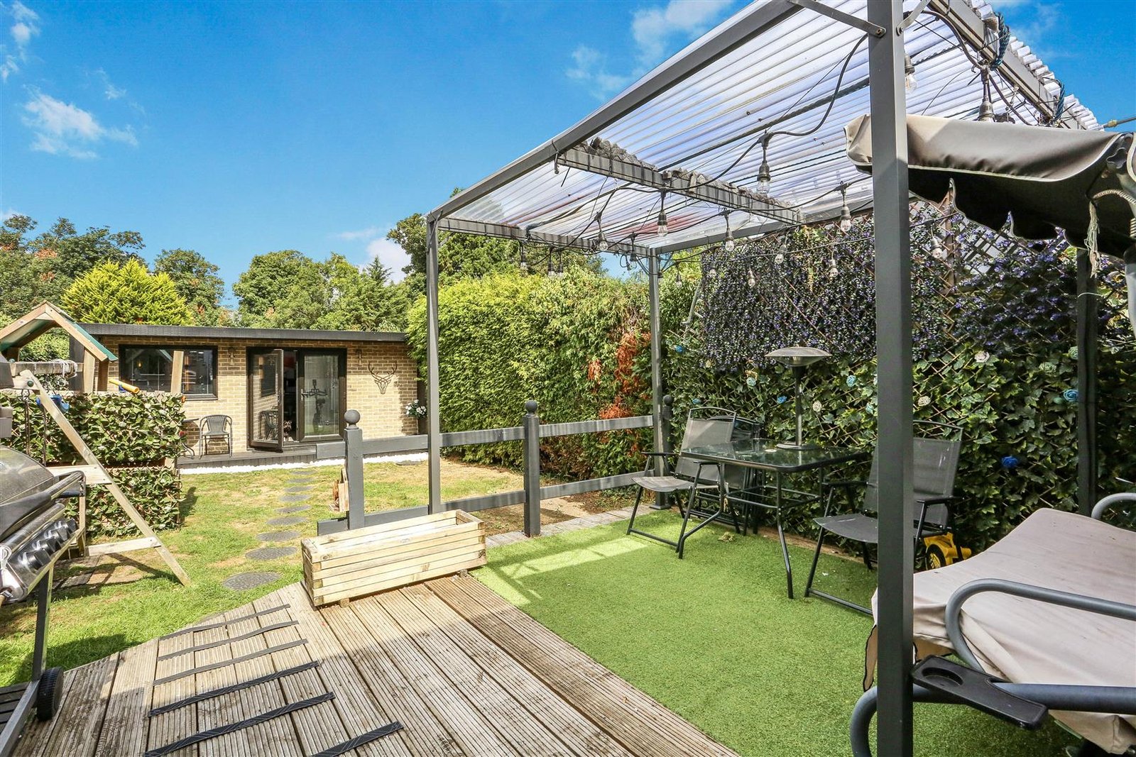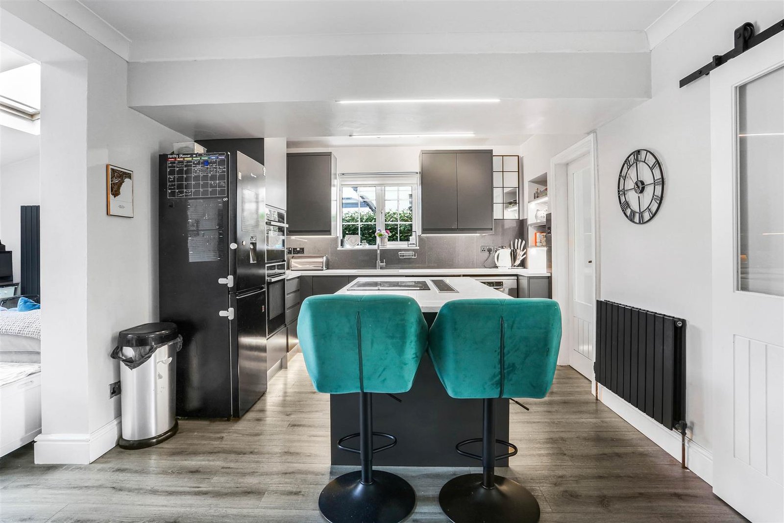 The kitchen seamlessly flows into a spacious second reception room, which opens out onto a lovely rear terrace, providing an excellent space for outdoor dining or simply enjoying the fresh air. This layout is perfect for modern family living, allowing for both social interaction and private moments.