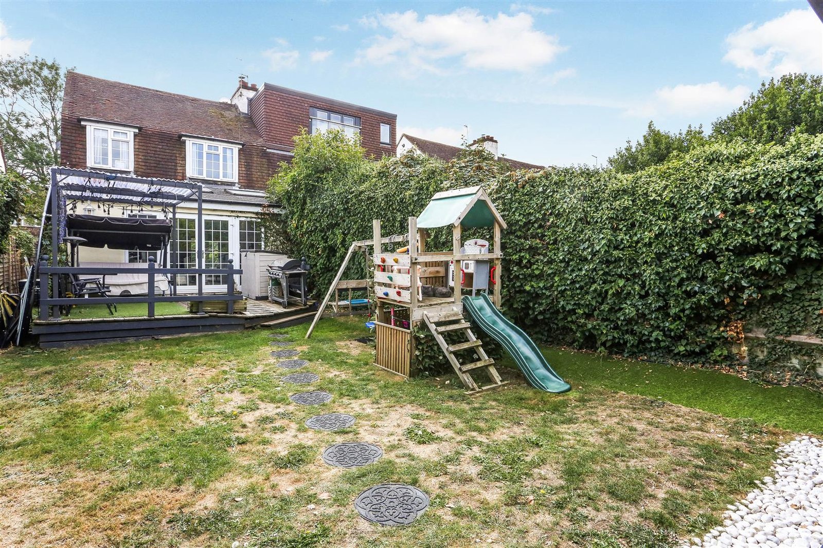 Set within the desirable location of Ruden Way, Epsom, this charming three-bedroom semi-detached house presents a delightful blend of contemporary living and traditional character. The property boasts attractive tile-hung elevations, enhancing its curb appeal and inviting you into a warm and welcoming home lovingly renovated by the current owners.