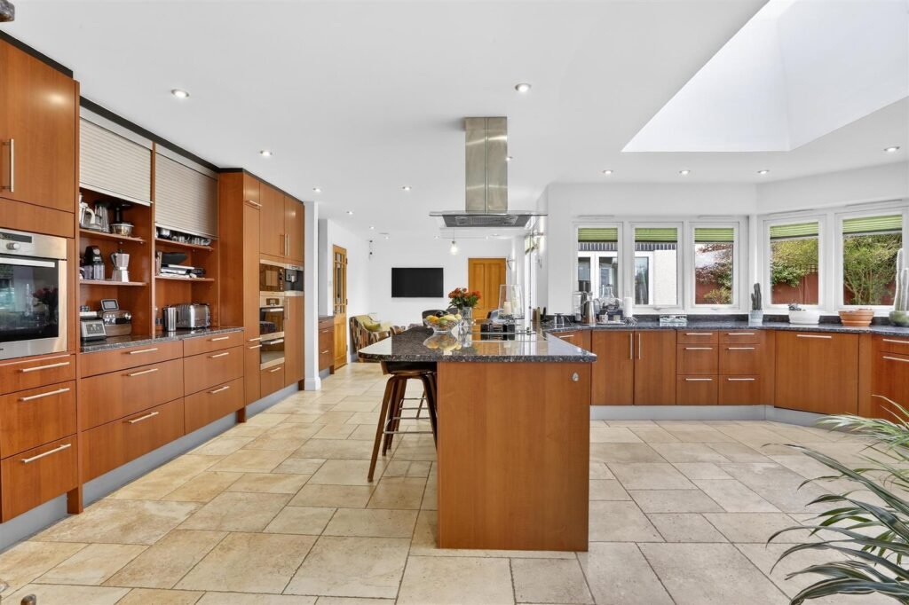 This impressive residence provides generous and versatile living space, ideally suited to modern family life. The ground floor features multiple reception areas, including a spacious principal reception room and a large family room leading through to a dining area, creating a seamless space ideal for both formal entertaining and everyday living. At the heart of the home is a striking kitchen and breakfast room, thoughtfully designed as a central hub for family life, with views and access to the garden. This space is complemented by a separate utility area, pantry, and additional storage, enhancing practicality. A further ground floor bedroom with en-suite facilities offers excellent flexibility for guests, multi-generational living, or independent use, while a gym with adjoining steam room provides a luxurious wellness element, alongside an integral garage.